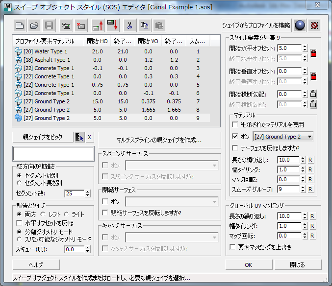 SOS 要素リストで現在ハイライト表示されている要素の設定を編集します。 各要素はスイープ オブジェクトの単一のサーフェスを表します。それぞれの要素には水平オフセットおよび垂直オフセットと、独立したマテリアル チャネル定義があります。