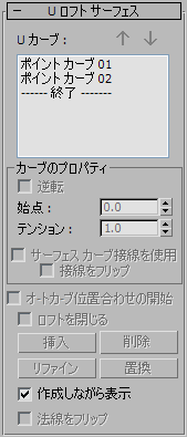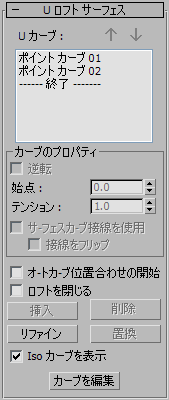 U ロフト サブオブジェクトが選択されていると、U ロフトのパラメータのロールアウトが[修正](Modify)パネルの下部に表示されます。このロールアウトは、U ロフト サブオブジェクトが 1 つ選択されているときにのみ表示されます。複数の U ロフトを同時に編集できないため、他の NURBS サブオブジェクトと異なり、複数の U ロフト サブオブジェクトが選択されているときは、ロールアウトが表示されません。