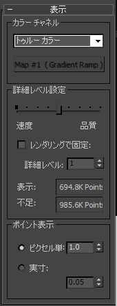 ヒント: オブジェクトをソリッド状態のままにしてパフォーマンスを向上させるには、[ポイント表示](Point Display)の設定を相対的に大きくして、[詳細レベル](Level Of Detail)の設定を小さくする方法があります。