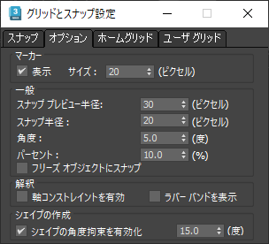 既定では、ダイアログ ボックスが開くと、[標準](Standard)カテゴリがアクティブで、[グリッド ポイント](Grid Points)オプションが有効になった[スナップ](Snaps)パネルが表示されます。