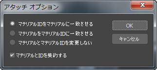 異なるマテリアルが割り当てられた 2 つ以上のオブジェクトをアタッチすると、[アタッチ オプション](Attach Options)ダイアログ ボックスが表示されます。2 つのオブジェクトにサブマテリアルとマテリアル ID を組み合わせる 3 つの方法が提供されます。