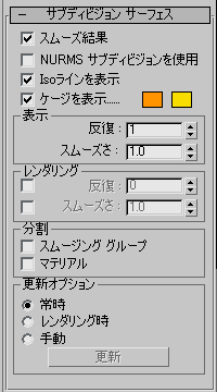 メッシュ スムーズのスタイルでオブジェクトにサブディビジョンを適用し、低解像度の「ケージ」メッシュを操作しながら、同時にスムーズで細分化された結果を見ることができるようにします。このロールアウトは、すべてのサブオブジェクト レベル、およびオブジェクト レベルで使用することができ、常にオブジェクト全体に影響を与えます。