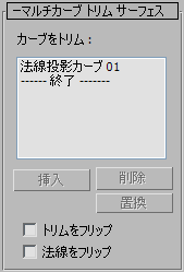 マルチカーブ トリム サブオブジェクトが選択されている間、マルチカーブ トリム パラメータを持ったロールアウトが表示されています。このロールアウトは、マルチカーブ トリム サブオブジェクトが 1 つ選択されているときにのみ表示されます。一度に 2 つ以上のマルチカーブ トリム サブオブジェクトを編集することはできないため、他の NURBS サブオブジェクトと異なり、複数のマルチカーブ トリム サブオブジェクトが選択されている場合、ロールアウトが表示されません。