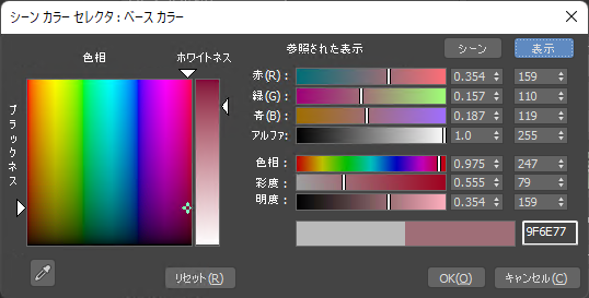 [カラー セレクタ](Color Selector)ダイアログ ボックスを使用して、ライト カラー、マテリアル カラー、バックグラウンド カラー、カスタム オブジェクトのカラーなど、さまざまなカラー パラメータを指定します。3 つの異なるカラー モデルを使用してレンダリング スペースまたは表示スペースのいずれかに値を設定し、目的のカラーをゼロにすることができます。