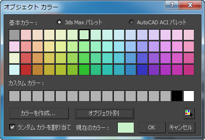 3ds max パレットを使用すると、[オブジェクト カラー](Object Color)ダイアログ ボックスには、16 色のカラー見本のパレットが表示されます。[カスタム カラー](Custom Colors)からカラー見本を選択し、[カラーを作成](Add Custom Colors)をクリックして、16 色のカラー見本のそれぞれに任意の色を定義できます。