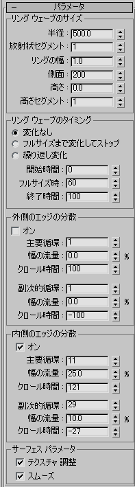 これらの設定は、リングウェーブが大きさゼロからフル サイズまで成長するリングウェーブ アニメーションで使用します。