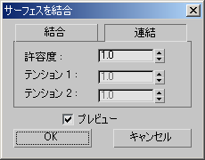 3ds Max 単位の距離です。結合しようとしているサーフェスの隔たりがこの値より大きい場合、まずブレンド サーフェスが作成され、それから 3 つが結合されます。隙間がこの値より小さい場合、またはサーフェスが重なったり、完全に一致するような場合、3ds Max ではブレンドは作成されません。