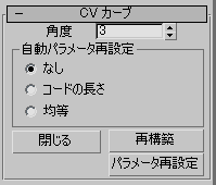 この領域のラジオ ボタンを使用すると、自動パラメータ再設定を指定できます。このコントロールは、[パラメータ再設定](Reparameterize)ダイアログ ボックスにあるコントロールと似ていますが、違いが 1 つあります。[なし](None)以外を選択したときは、3ds Max に自動的にカーブのパラメータ設定が行われます。つまり、CV の移動、リファインなどの編集を行ったときは常に、パラメータが再設定されます。