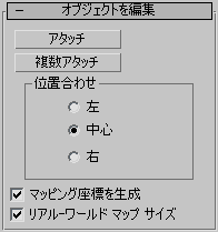 オブジェクトに適用されるテクスチャがマッピングされたマテリアルのスケーリング方法を制御します。スケール値は、適用されるマテリアルの[座標](Coordinates)ロールアウトの[リアル-ワールド スケールを使用](Use Real-World Scale)の設定によってコントロールします。既定値はオフです。