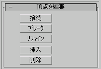 [頂点](Vertex)サブオブジェクト選択の[挿入](Insert)ボタンと同じ機能です。1 つまたは複数の頂点を挿入し、追加のセグメントを作成します。有効な挿入ポイントの上にカーソルを移動すると、カーソルは「挿入」アイコンに変わります。新しい頂点とセグメントの挿入を終了する場合は右クリックします。