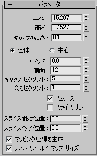 [高さ](Height)の値に指定する内容を決定します。[全体](Overall)では、オブジェクトの全体の高さを指定します。[中心](Centers)では、円柱の中心部の高さを指定します。円錐形のキャップの高さは含まれません。