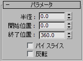 チェックマークを付けると、円弧スプラインの方向が反転し、最初の頂点は開いた円弧の反対側に配置されます。シェイプが元のシェイプのままであれば、また編集可能なスプラインでなければ、[反転](Reverse)チェック ボックスを切り替えると、その方向が切り替わります。円弧がいったん編集可能なスプラインに変換されると、[スプライン](Spline)サブオブジェクト レベルの[反転](Reverse)ボタンを使用して方向を反転できます。