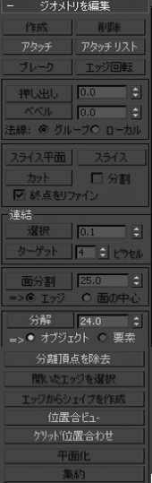 これらのコントロールの詳細については、「[ジオメトリを編集](Edit Geometry)ロールアウト(メッシュ)」を参照してください。