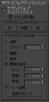 これら 2 つの領域内のコントロールでは、[サブディビジョンでディスプレイスメント](Subdivision Displacement)にチェックマークを付けた場合に、ディスプレイスメント マップを適用する方法を指定します。これらは、NURBS サーフェスで使用される[サーフェス近似](Surface Approximation)コントロールと同一です。