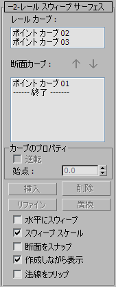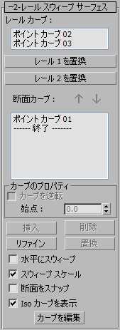 2-レール スウィープ サブオブジェクトを選択すると、2-レール スウィープ パラメータを含むロールアウトが表示されます。このロールアウトは、2-レール スウィープ サブオブジェクトが 1 つ選択されているときにのみ表示されます。一度に複数の 2-レール スウィープを編集することはできないので、他の NURBS サブオブジェクトとは異なり、複数の 2-レール スウィープ サブオブジェクトが選択されたときは、このロールアウトは表示されません。