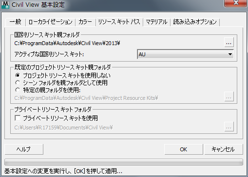既定では、国別リソース キット フォルダは、 C:\programdata\autodesk\civil view\<Version>\ のディレクトリ パスに格納されています。