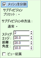 編集可能ポリゴン オブジェクトを再分割するサーフェス近似設定を指定します。これらのコントロールは、NURBS サーフェスのサーフェス近似設定と同様に動作します。ディスプレイスメント マッピングを編集可能ポリゴン オブジェクトに適用したときに使用されます。