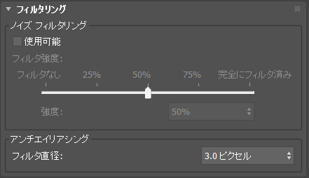[フィルタ](Filtering)ロールアウトには、ART レンダラーのノイズおよびアンチエイリアシングをコントロールするための設定が含まれています。