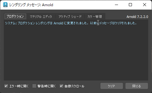 レンダリング メッセージ ウィンドウには、(既定値のスキャンライン レンダリングではない)一部のレンダリングからのエラーなどのメッセージが表示されます。