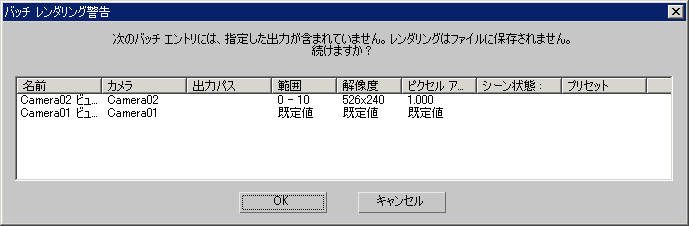 どちらの形式の[バッチ レンダリング警告](Batch Render Warning)ダイアログ ボックスにも、[バッチ レンダリング](Batch Render)ダイアログ ボックスに表示されるタスク キューの列が含まれます。主な違いは、レンダリングに使用するカメラを指定できるチェック ボックスがないことです。 このタスク キューには、保存されているファイルを上書きする可能性があるカメラ、出力のパスまたはファイル名が設定されていないカメラ、または無効な出力パスが指定されているカメラのみが表示されます。