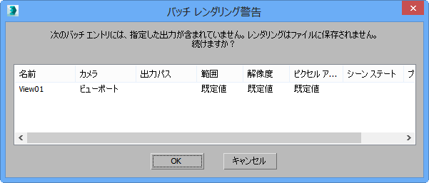 この[バッチ レンダリング警告](Batch Render Warning)ダイアログ ボックスは、[バッチ レンダリング](Batch Render)ダイアログ ボックスで[レンダリング](Render)ボタンをクリックしたときに、レンダリングする 1 つ以上のタスクに出力のパスまたはファイル名が含まれていない場合に表示されます。このダイアログ ボックスは、以前にレンダリングしたイメージを上書きする可能性がある場合にも表示されます。