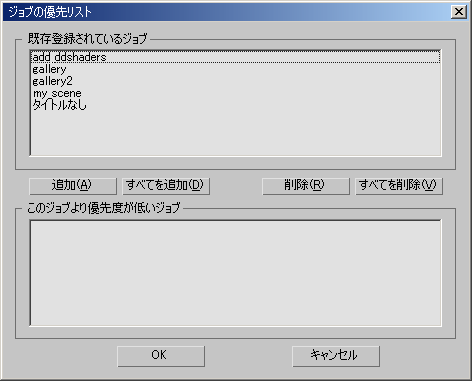 このダイアログ ボックスでは、他のジョブが終了するまでレンダリングを開始できないジョブを指定します。2 つのリストと[追加](Add)および[除去](Remove)ボタンを使って、現在のジョブを開始する前にレンダリングを終了しなければならないジョブのリストを構築します。