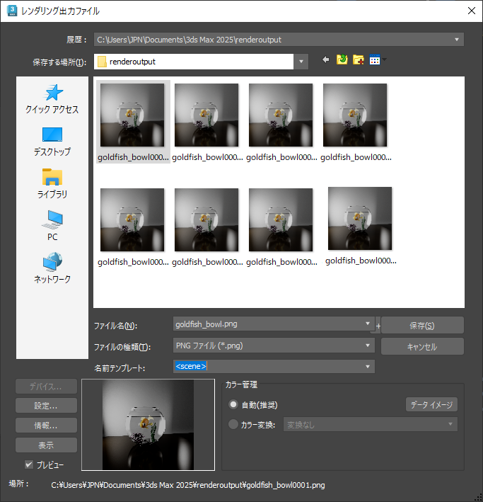 - レンダリング時に保存するためのファイル情報を設定します。出力ファイルの種類を変更していない場合は、ダイアログ ボックスが閉じられます。
