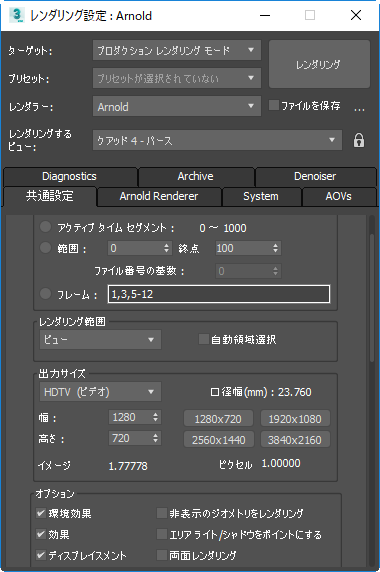 このパネルには、静止イメージまたはアニメーションをレンダリングするかどうか、レンダリング出力の解像度の設定など、レンダリングに対する一般コントロールがあります。