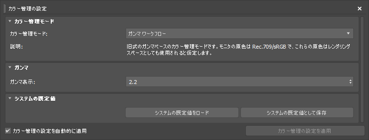 また、変更をすぐに適用しない場合は、[カラー管理設定を自動的に適用](Apply Color Management Changes Automatically)をオフにします。オプションの変更が完了したら、[カラー管理設定を適用](Apply Color Management Settings)をクリックしてシーンを更新します。