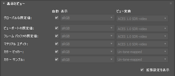 レンダリング スペース値のカラー値を、さまざまなウィンドウやUI要素でどのように表示するかをコントロールします。すべての要素を一度にコントロールするには[グローバルな既定値](Global Default)を使用し、さまざまな要素のオプションを個別に設定するには[拡張設定を表示](Show Advanced Settings)をオンにします。