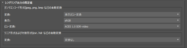 レンダリング出力ファイルに既定で適用するカラー変換をコントロールします。レンダリング時にここで設定されている既定値を使用しない場合は、レンダリング出力ファイル](Render Output File)ダイアログで別の変換を選択するオプションがあります。