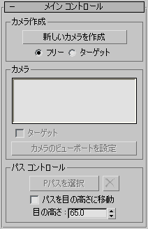 カメラ リストで選択したカメラをターゲットまたはフリーに切り替えます。フリー カメラで[ターゲット](Targeted)にチェック マークを付けると、ターゲット カメラに変化し、ターゲット カメラで[ターゲット](Targeted)のチェック マークをはずすとフリー カメラに変化します。既定値ではチェックマークが付いていません。