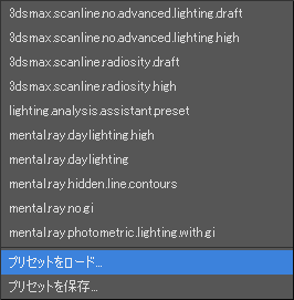 3ds Max に付属している既定値のプリセットに加えて、ユーザが独自のプリセットを作成することもできます。プリセット リストの一番下には、独自のカスタム プリセットを使用、作成,できる、2 つの選択肢があります。