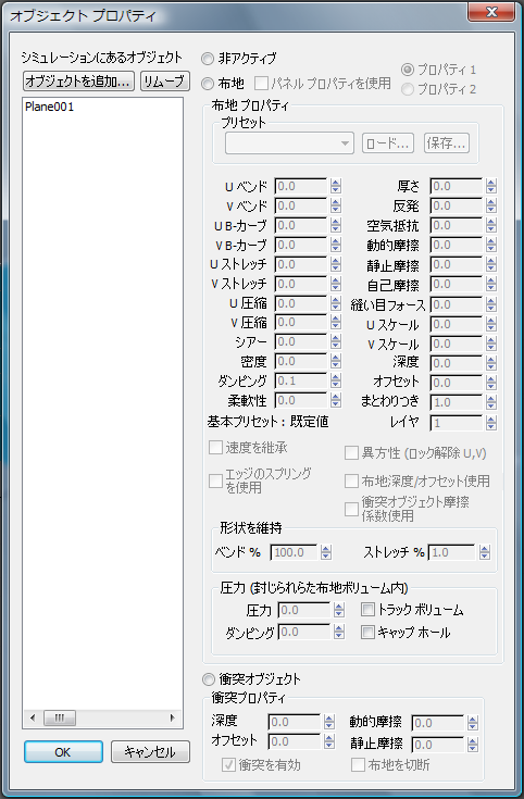 [オブジェクト プロパティ](Object Properties)ダイアログ ボックスを使って、布オブジェクトか衝突オブジェクトかに関係なく、布地のシミュレーションに追加するオブジェクトを指定して、それらに関連付けるパラメータを定義します。