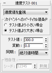 [速度テスト](Speed Test)テストが成功または失敗した場合に、テストがパーティクルを次のイベントに渡すかどうかを指定します。これは、[加速時に次イベント](True When Accelerates)および[減速時に次イベント](True When Decelerates)を除くすべてのテストで利用できます。既定値は、[テスト値より大きい場合](Is Greater Than Test Value)です。