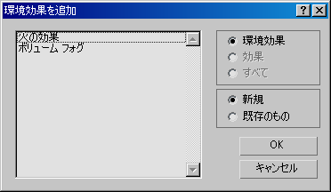[環境効果を追加](Add Atmosphere)ダイアログ ボックスを使用すると、環境効果に環境効果の装置を関連付けることができます。
