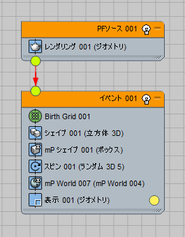 ローカル イベントであるイベント 001 には、[発生グリッド](Birth Grid)、[シェイプ](Shape)、[mParticles シェイプ](mParticles Shape)、[スピン](Spin)、[mParticles ワールド](mParticles World)、および[表示](Display)の各オペレータが含まれます。