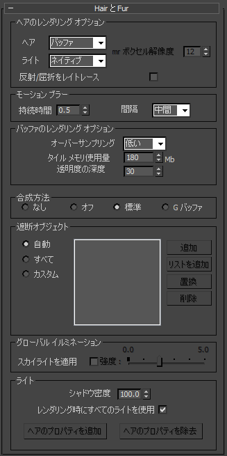 スカイライト、mr エリア オムニ、mr エリア スポット、IES サン、IES スカイ、mr Sky、mr Sun のライト タイプは、「バッファ」方法でヘアをレンダリングする場合にはサポートされません。だたし、mr エリア オムニ、mr エリア スポット、mr Sky、mr Sun は、ヘアで「mr prim」方法を使用する場合にサポートされます。
