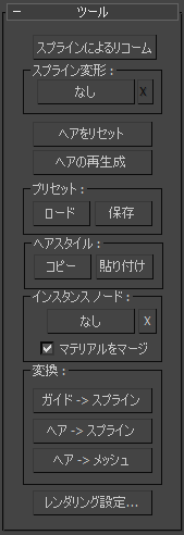 このロールアウトには、Hair に関するさまざまなタスクを実行するためのツールが含まれています。これらのツールでは、既存のスプライン オブジェクトからヘアスタイルを作成したり、ヘアをリセットしたり、特定のヘアスタイルに加えてモディファイヤの汎用プリセットをロードしたり保存したりできます。また、このロールアウトでは、現在のシーンからヘアとして使用するオブジェクトを指定することもできます。たとえば庭園を作成するために、1 つまたは複数の花を選択したりすることができます。