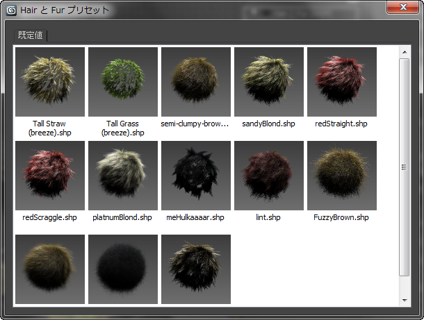 [ヘア プリセット](Hair Presets)ダイアログ ボックスを開きます。このダイアログ ボックスには、プリセットのリストが名前付き見本の形式で表示されます。プリセットをロードするには、見本をダブルクリックします。3ds Max には、プリセットのサンプルがいくつか含まれています。