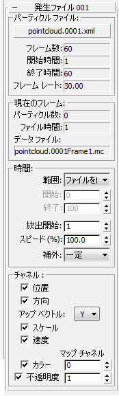 パーティクル生成パラメータを定義する XML ポイントクラウドの名前を示すボタンが含まれます。別のファイルを選択するには、ボタンをクリックし、開いたファイル ダイアログを使用します。また、この領域には、読み取り専用の、パーティクル ファイルについての基礎データ(フレームの合計数、開始時間と終了時間、およびアニメーション フレーム レート)が含まれます。