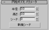 [円柱ギズモ](CylGizmo)を使用すると、シーンに円柱形のギズモを作成できます。[円柱ギズモ](CylGizmo)ボタンをクリックすると、[円柱ギズモ パラメータ](Cylinder Gizmo Parameters)ロールアウトが表示されます。