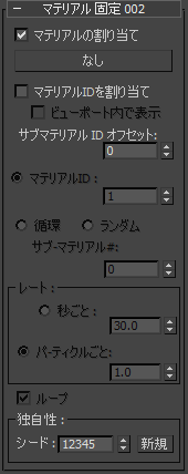 • [マテリアル ID](Material ID)すべてのパーティクルに同じマテリアル ID を割り当てます。 数値フィールドを使用して、ID の値を設定してください。