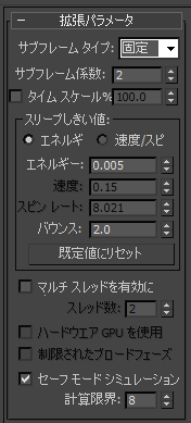 ヒント: オブジェクトが動く必要がないときに動くなど、シミュレーションが不安定になった場合は、[サブフレーム係数](Subframe Factor)の値を上げてみてください。[サブフレーム係数](Subframe Factor)の値は、