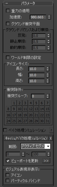 - ヘルパー アイコンの寸法をワールド単位で設定します。通常、アイコンのサイズはシミュレーションに影響せず、重力の方向とグラウンド衝突平面を示すだけです。唯一の例外は、[ワールド制限の設定](Set World Limits) (前述を参照)がオンの場合です。