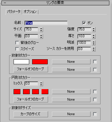- [放射状カラー](Radial Color)と[円形状カラー](Circular Color)で設定されたカラーをミックスします。編集ボックスを 0 に設定すると、[放射状カラー](Radial Color)で設定された値だけが使用され、編集ボックスを 100 に設定すると、[円形状カラー](Circular Color)で設定された値だけが使用されます。0 から 100 までのどの値でも、2 つの値がミックスされます。