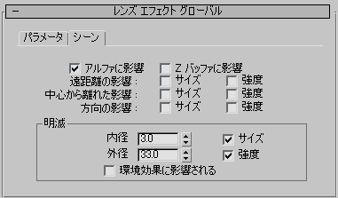[レンズ エフェクト グローバル](Lens Effects Globals)ロールアウト、[シーン](Scene)パネル