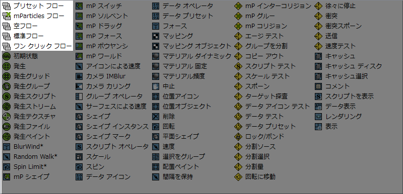 フロー カテゴリには、初期パーティクル システムを設定するためのことなる種類のショートカットが含まれます。フローを利用するには、単にそれをコンテナから[パーティクル ビュー](Particle View)メイン ウィンドウにドラッグします。利用可能なフローは、このトピックの最後に列挙されています。