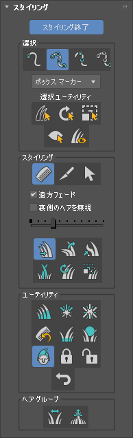 ブラシ サイズ スライダの下のスタイリング ボタンは、[ヘア ブラシ](Hair Brush)をオンにした場合にのみ使用可能になります。