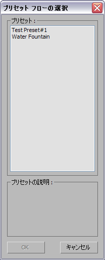 [プリセット フロー](Preset Flow)は、あらかじめ保存しておいたパーティクル フロー設定を現在のシーンにマージします。これにより、フローを現在のフロー内のイベント、または新しいパーティクル システムの開始ポイントとして使用できます。